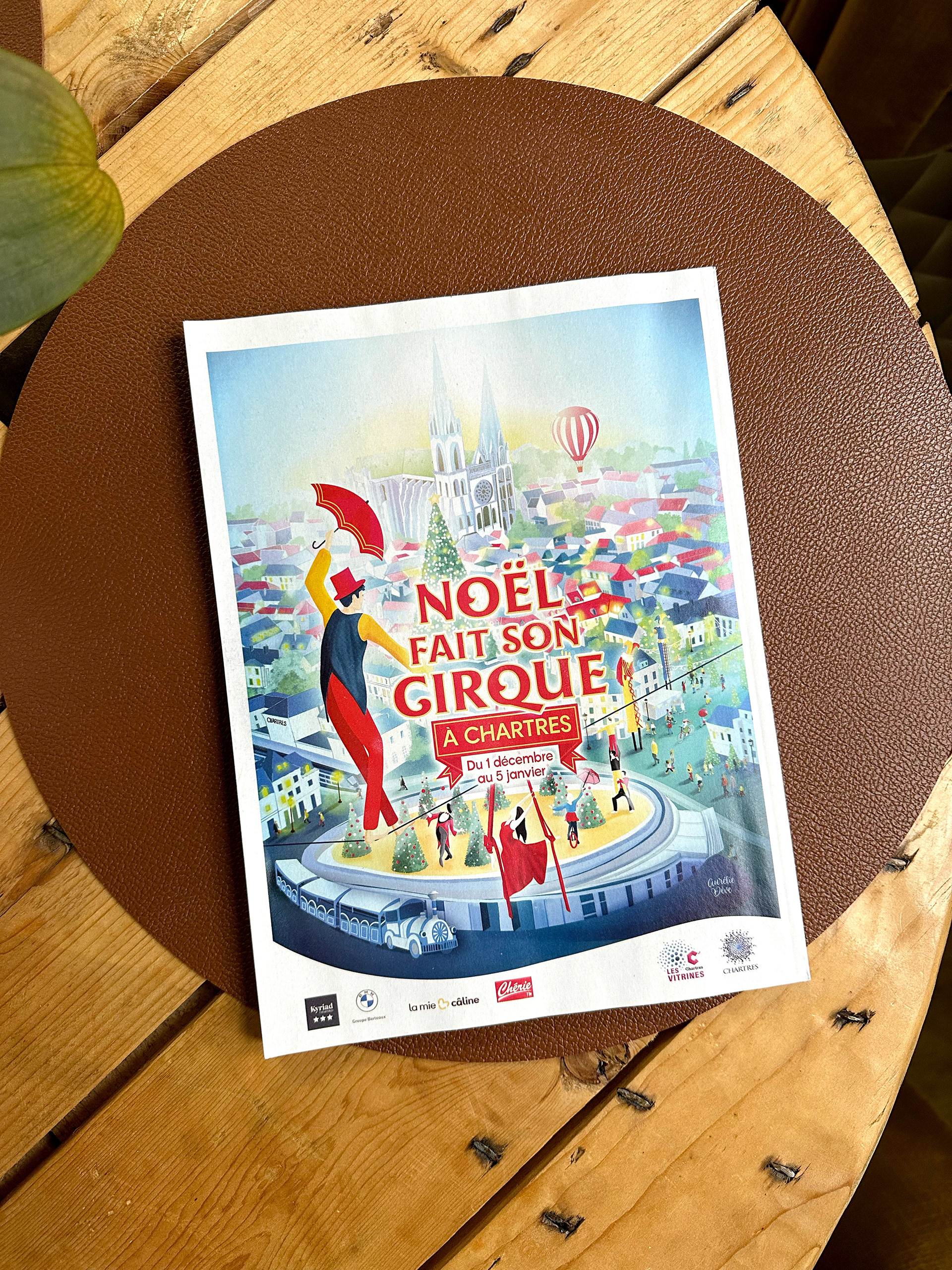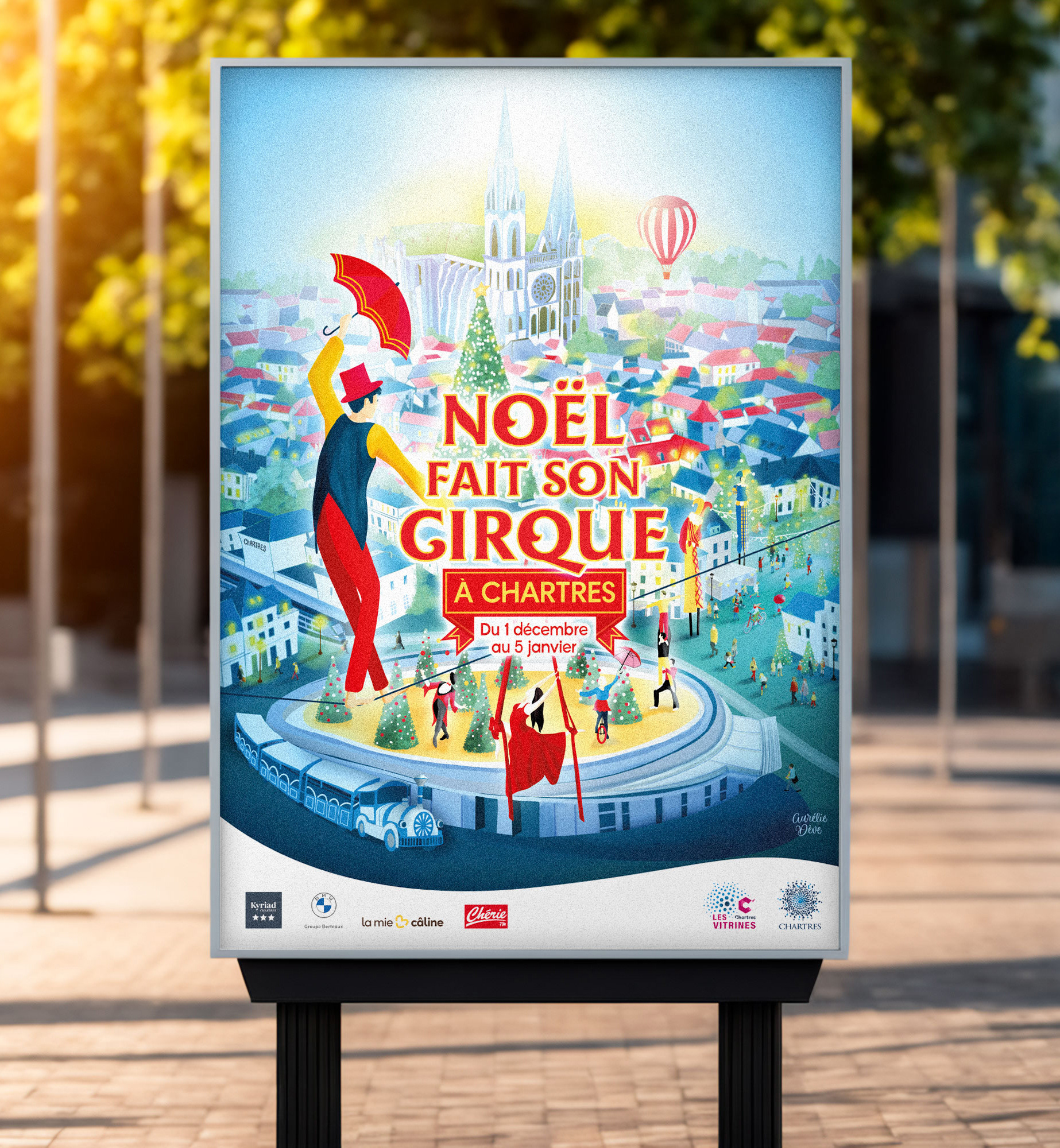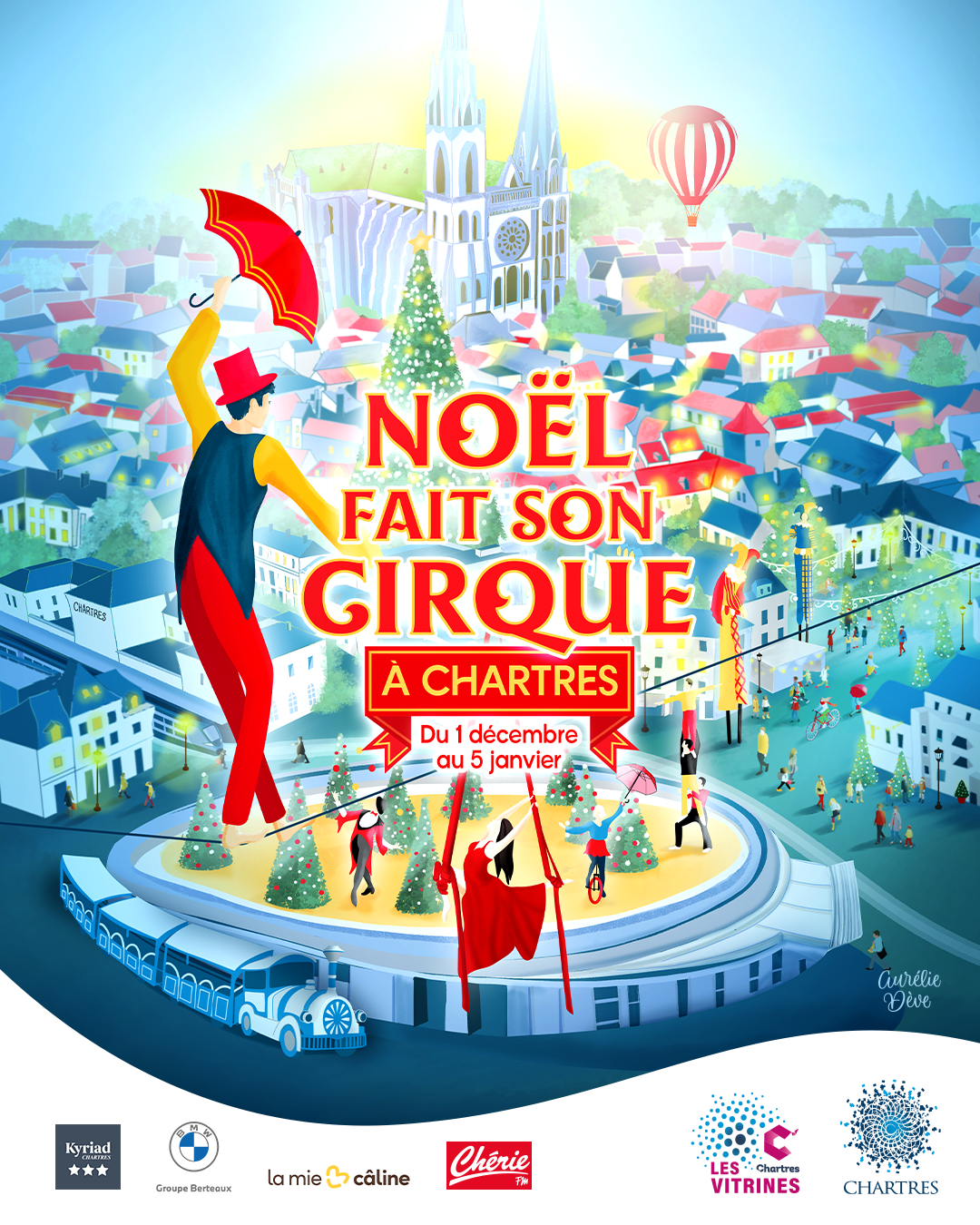En équilibre sur son fil, le funambule ouvre la scène et invite le regard à plonger sur la ville en fête. À ses pieds, Chartres s’illumine et s’anime, prête à accueillir un Noël pas comme les autres. Le Colisée devient piste de cirque, les rues s’emplissent de magie et les sapins côtoient acrobates et jongleurs, pendant que la majestueuse cathédrale veille sur une ville en ébullition.