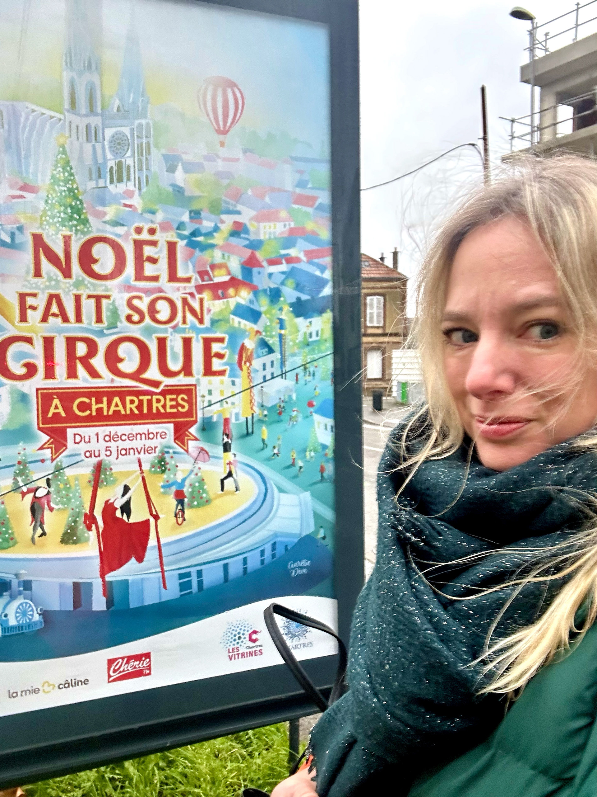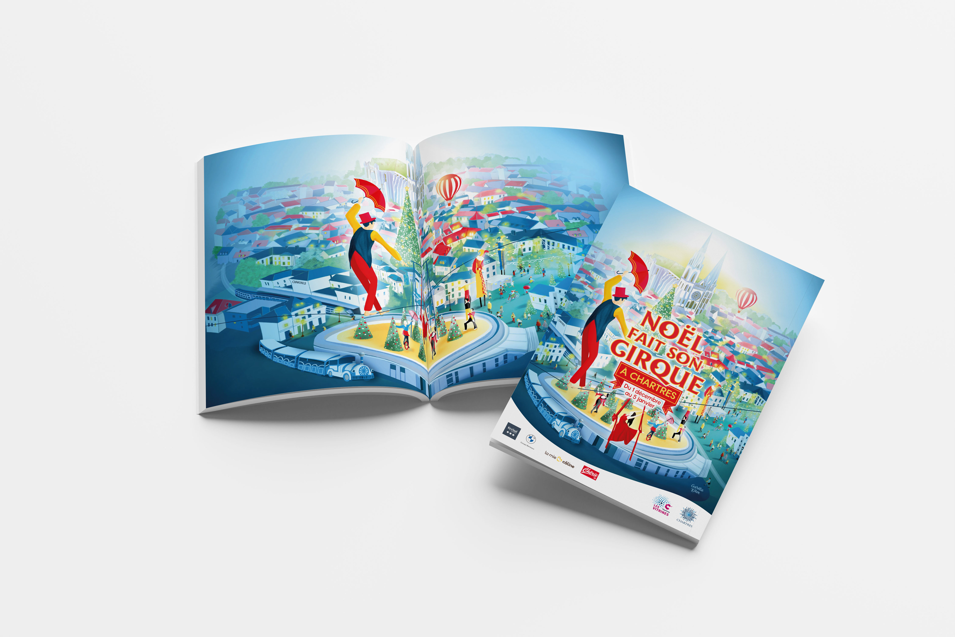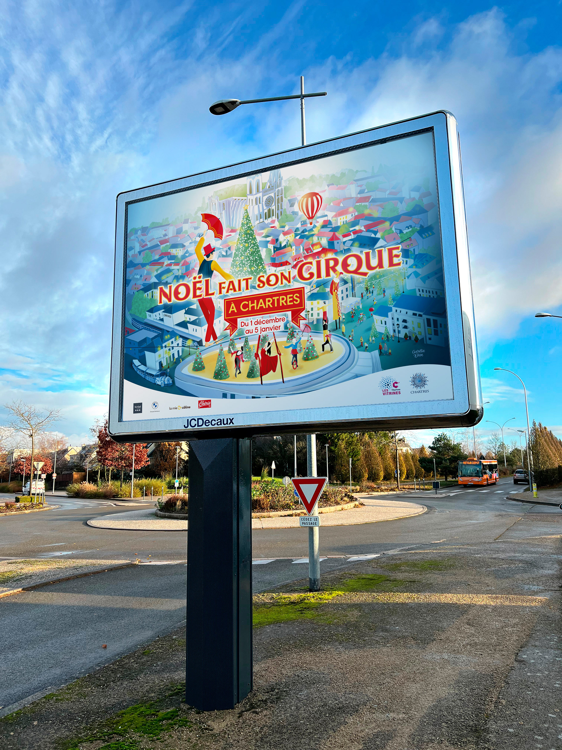 En équilibre sur son fil, le funambule ouvre la scène et invite le regard à plonger sur la ville en fête. À ses pieds, Chartres s’illumine et s’anime, prête à accueillir un Noël pas comme les autres. Le Colisée devient piste de cirque, les rues s’emplissent de magie et les sapins côtoient acrobates et jongleurs, pendant que la majestueuse cathédrale veille sur une ville en ébullition.